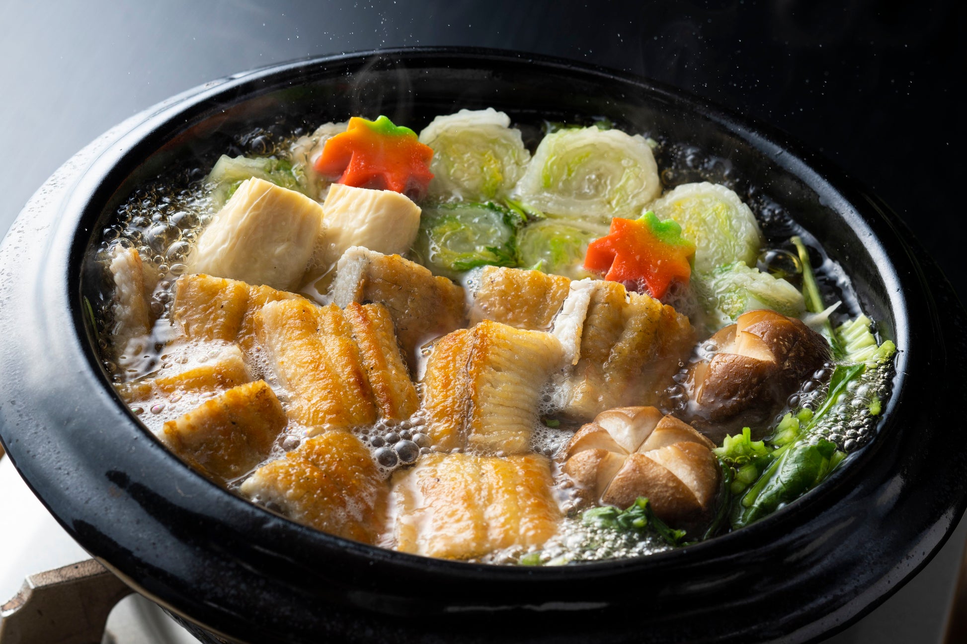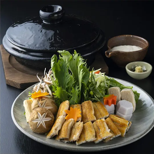 冬の鰻は、脂がのって、鍋物にしても最適。国産の活け鰻を白焼きにして、白菜、牛蒡、九条葱などの野菜とともに、詰め合わせました。秘伝のだしは、うなぎのうまみを十分に引き出し、弊店の名物 ”とろろ”とともにお召し上がりください。